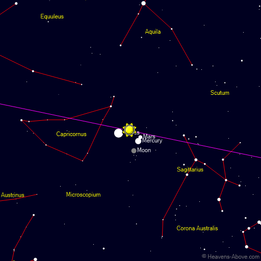| Minimum altitude: | 00:31 | -73.5° | 0° | | Astronomical twilight begins: | 06:01 | -18.0° | 102° | | Nautical twilight begins: | 06:32 | -12.0° | 107° | | Civil twilight begins: | 07:04 | -6.0° | 111° | | Sunrise: | 07:32 | -0.8° | 115° | | Maximum altitude: | 12:31 | 32.5° | 180° | | Sunset: | 17:30 | -0.8° | 245° | | Civil twilight ends: | 17:59 | -6.0° | 249° | | Nautical twilight ends: | 18:30 | -12.0° | 253° | | Astronomical twilight ends: | 19:01 | -18.0° | 258° |