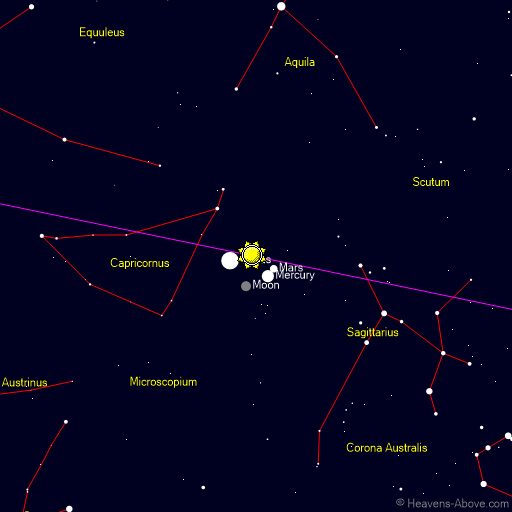| Minimum altitude: | 01:15 | -64.9° | 0° | | Astronomical twilight begins: | 06:54 | -18.0° | 101° | | Nautical twilight begins: | 07:30 | -12.0° | 107° | | Civil twilight begins: | 08:06 | -6.0° | 113° | | Sunrise: | 08:39 | -0.8° | 119° | | Maximum altitude: | 13:15 | 23.9° | 180° | | Sunset: | 17:51 | -0.8° | 241° | | Civil twilight ends: | 18:24 | -6.0° | 247° | | Nautical twilight ends: | 19:00 | -12.0° | 253° | | Astronomical twilight ends: | 19:36 | -18.0° | 259° |