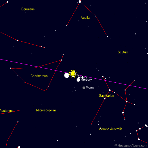 | Minimum altitude: | 00:00 | -60.4° | 4° | | Astronomical twilight begins: | 05:35 | -18.0° | 101° | | Nautical twilight begins: | 06:14 | -12.0° | 108° | | Civil twilight begins: | 06:54 | -6.0° | 115° | | Sunrise: | 07:31 | -0.8° | 122° | | Maximum altitude: | 11:51 | 19.4° | 180° | | Sunset: | 16:11 | -0.8° | 238° | | Civil twilight ends: | 16:48 | -6.0° | 245° | | Nautical twilight ends: | 17:28 | -12.0° | 252° | | Astronomical twilight ends: | 18:07 | -18.0° | 259° |