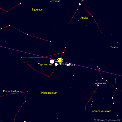 | Minimum altitude: | 05:12 | -70.6° | 360° | | Astronomical twilight begins: | 10:40 | -18.0° | 100° | | Nautical twilight begins: | 11:11 | -12.0° | 105° | | Civil twilight begins: | 11:44 | -6.0° | 110° | | Sunrise: | 12:12 | -0.8° | 114° | | Maximum altitude: | 17:13 | 32.3° | 180° | | Sunset: | 22:13 | -0.8° | 246° | | Civil twilight ends: | 22:42 | -6.0° | 250° | | Nautical twilight ends: | 23:14 | -12.0° | 255° | | Astronomical twilight ends: | 23:45 | -18.0° | 260° |