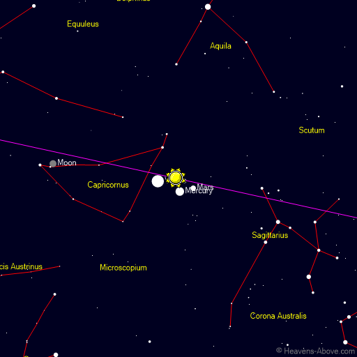 | Astronomical twilight begins: | 05:07 | -18.0° | 101° | | Nautical twilight begins: | 05:40 | -12.0° | 106° | | Civil twilight begins: | 06:14 | -6.0° | 112° | | Sunrise: | 06:44 | -0.8° | 116° | | Maximum altitude: | 11:34 | 28.8° | 180° | | Sunset: | 16:25 | -0.8° | 244° | | Civil twilight ends: | 16:55 | -6.0° | 249° | | Nautical twilight ends: | 17:28 | -12.0° | 254° | | Astronomical twilight ends: | 18:01 | -18.0° | 259° | | Minimum altitude: | 23:34 | -68.8° | 360° |