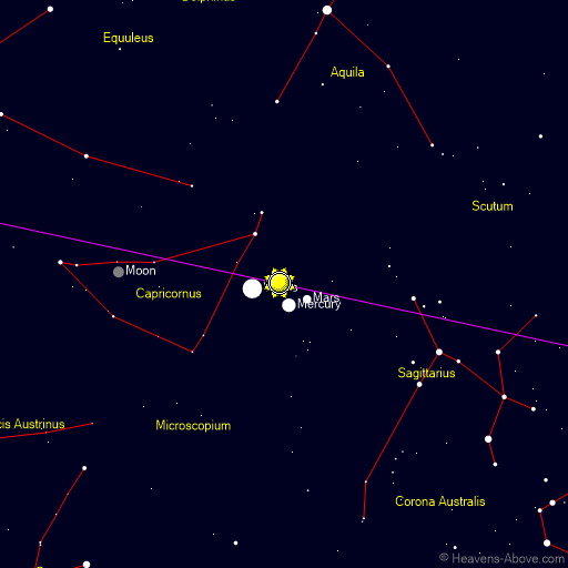 | Minimum altitude: | 05:08 | -68.8° | 0° | | Astronomical twilight begins: | 10:41 | -18.0° | 101° | | Nautical twilight begins: | 11:14 | -12.0° | 106° | | Civil twilight begins: | 11:48 | -6.0° | 112° | | Sunrise: | 12:18 | -0.8° | 116° | | Maximum altitude: | 17:08 | 28.7° | 180° | | Sunset: | 21:58 | -0.8° | 244° | | Civil twilight ends: | 22:28 | -6.0° | 249° | | Nautical twilight ends: | 23:02 | -12.0° | 254° | | Astronomical twilight ends: | 23:35 | -18.0° | 259° |