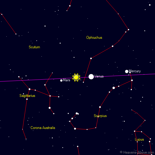 | Astronomical twilight begins: | 05:55 | -18.0° | 105° | | Nautical twilight begins: | 06:34 | -12.0° | 112° | | Civil twilight begins: | 07:15 | -6.0° | 119° | | Sunrise: | 07:54 | -0.8° | 126° | | Maximum altitude: | 11:58 | 17.0° | 180° | | Sunset: | 16:03 | -0.8° | 234° | | Civil twilight ends: | 16:41 | -6.0° | 241° | | Nautical twilight ends: | 17:22 | -12.0° | 248° | | Astronomical twilight ends: | 18:01 | -18.0° | 255° | | Minimum altitude: | 23:58 | -63.6° | 360° |