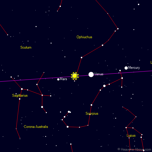 | Minimum altitude: | 00:18 | -60.0° | 360° | | Astronomical twilight begins: | 06:20 | -18.0° | 105° | | Nautical twilight begins: | 07:03 | -12.0° | 113° | | Civil twilight begins: | 07:48 | -6.0° | 121° | | Sunrise: | 08:30 | -0.8° | 129° | | Maximum altitude: | 12:19 | 13.8° | 180° | | Sunset: | 16:07 | -0.8° | 231° | | Civil twilight ends: | 16:50 | -6.0° | 239° | | Nautical twilight ends: | 17:34 | -12.0° | 247° | | Astronomical twilight ends: | 18:17 | -18.0° | 255° |